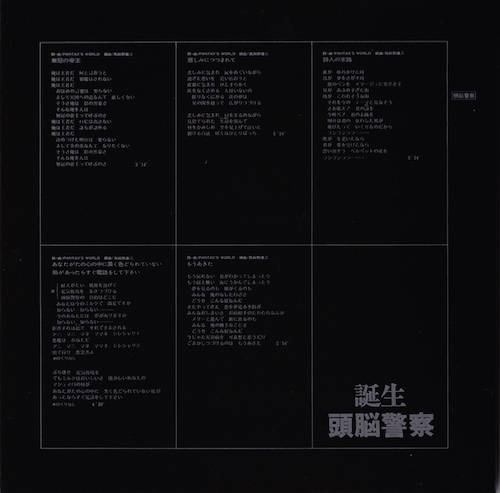 初めて聴く頭脳警察のレコードにしては『誕生』は少々地味すぎるかもしれない。ジャケットは真っ黒な地に銀色で歌詞が印刷してあるだけ、アーティスト写真もなし。見開きジャケの内側には拳と足のイラストというかデッサン画。それよりなにより相棒のトシがこのアルバムには不参加なのだ(だからアーティスト写真がないのも当然か)。これまでの“過激で政治的な”頭脳警察のイメージから転換を図るためスタジオでの制作に力を入れようと考えたパンタは、トシに正確なリズム・キープを要求するが“俺は機械じゃねぇ”と言ってトシは頭脳警察を離れていってしまう。そこでドラム田中清司、ベース式部秀明というスタジオ・ミュージシャンに演奏を依頼、キーボード・プレイヤー及び大きく導入されたストリングスのアレンジも含め馬飼野康二がアレンジャーとして参加し制作された。なおクレジットは無いがギターに水谷公生が参加、「鹿鳴館のセレナーデ」には石間秀樹が参加しているという(『結成40周年記念BOX・無冠の帝王』ブックレットより)。